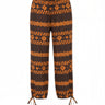 Fabric encased elastic at waist with functional self-fabric drawcord detail that is easily adjustable to be worn higher at true waist or lower depending on preference. Top edge has a self-turnback shirred ruffle finish that creates a sweet finishing touch. Slight drop crotch so there is flex fit ease built into the garment that supports free size fit. Straight leg that extends into tunnel detail at leg opening with encased self-drawcord that can be cinched at leg opening ankle area or can be just tied into cute bow at outer leg if wearer prefers!