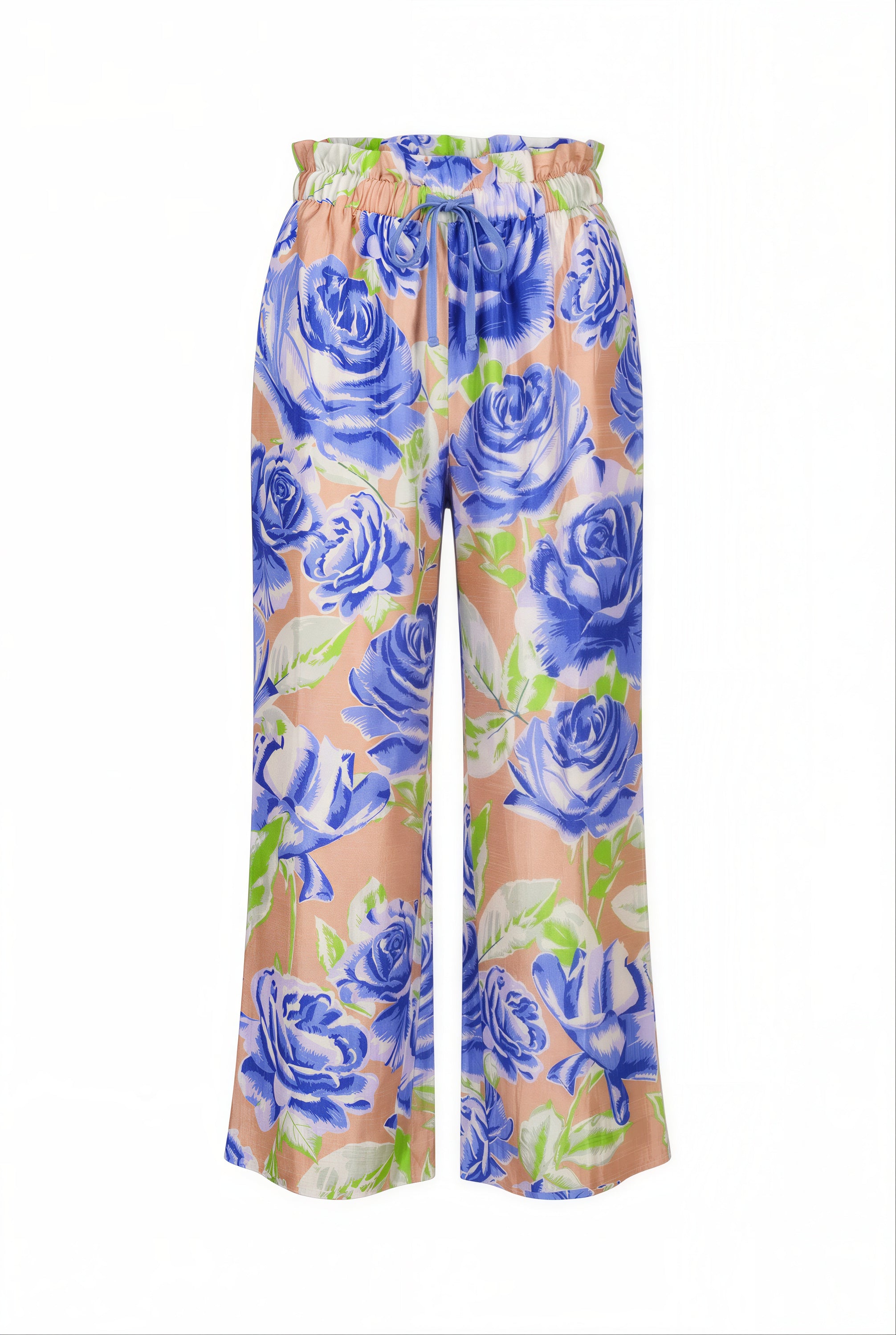 Fabric-encased elastic at waist with functional self-fabric drawcord detail that is easily adjustable to be worn higher at true waist or lower depending on preference. Top edge has a self-turnback shirred ruffle finish that creates a sweet finishing touch. Slight drop crotch so there is flex fit ease built into the garment that supports free size fit. Straight leg fit that now extends all the way through the bottom hem for a more hands-off and easeful finish!