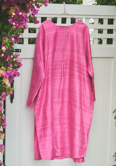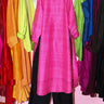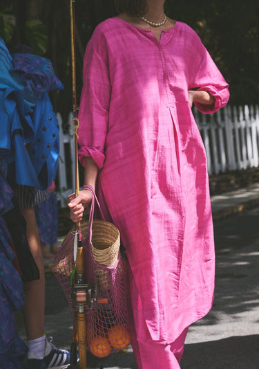Center front covered functional placket with self-button construction and embroidered buttonhole detail accented with a beautiful bib detail finish. Contoured neck band creates a polished finished look when undone or fully buttoned. Side self-bias binding ties at the princess seams help to create cinched waist look when tied at side body or tie at the front and back and leave loose and free! Can be easily worn as a long layering top or beach cover up. Side seam slits that hit around knee area revealing the leg in the perfect way. Deep hem finish that can be released to add length if needed.