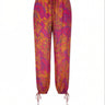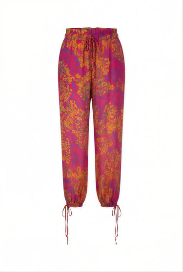 Fabric encased elastic at waist with functional self-fabric drawcord detail that is easily adjustable to be worn higher at true waist or lower depending on preference. Top edge has a self-turnback shirred ruffle finish that creates a sweet finishing touch. Slight drop crotch so there is flex fit ease built into the garment that supports free size fit. Straight leg that extends into tunnel detail at leg opening with encased self-drawcord that can be cinched at leg opening ankle area or can be just tied into cute bow at outer leg if wearer prefers!