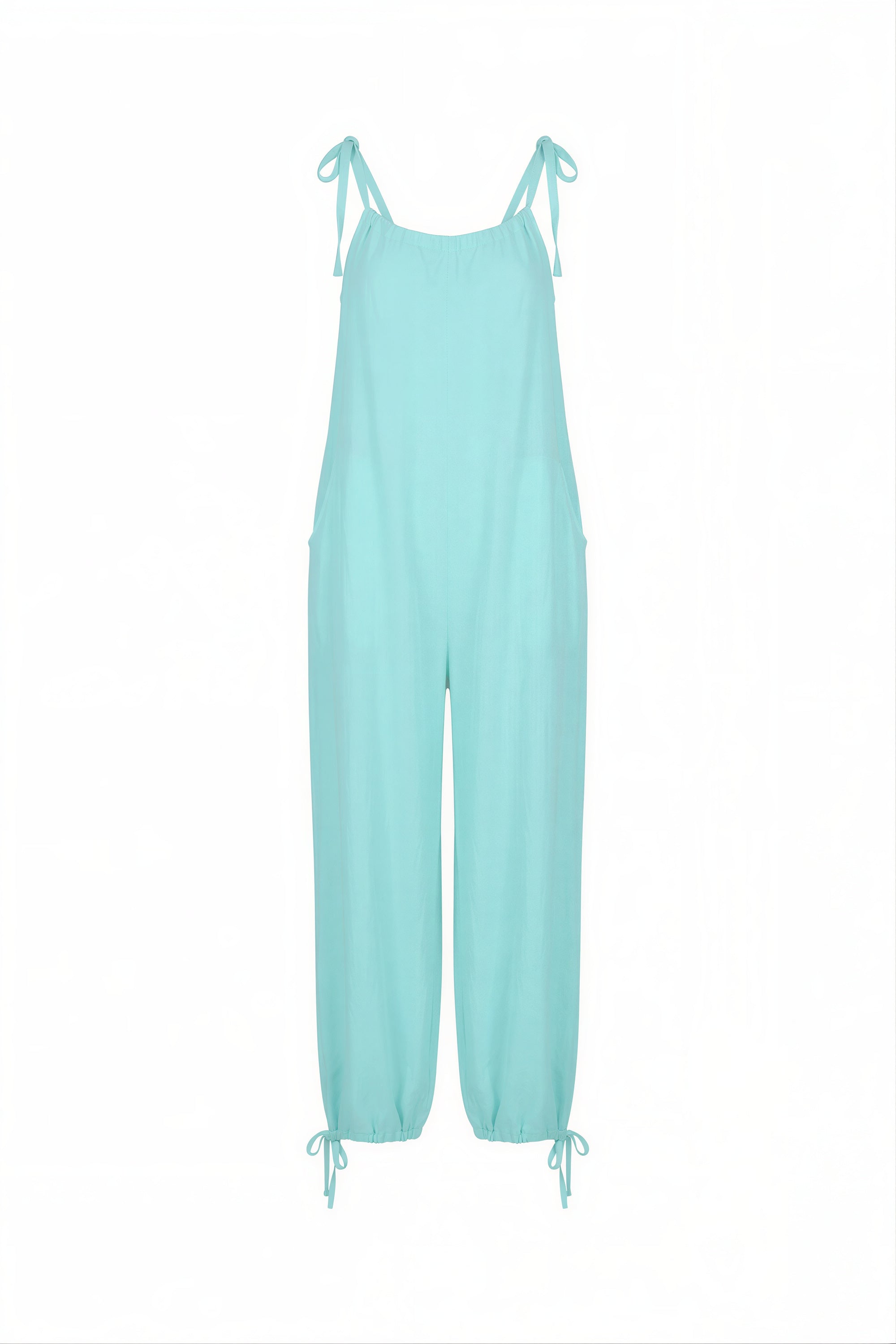 Low scoop neck at front and back providing a very beautiful, finished look regardless of your chest size. Adjustable drawstring ties around front and back neck extends into a wide leg, which also boasts a drawstring tie to support length changes. This creates cool relaxed volume that allows for flex fit and body journey shifts! The separate self-belt that accompanies the garment creates a waist shape when wrapped and tied or wear loose and free! Patch pockets give the cutest finish detail and makes for the coolest garment that you can just run around in with no fuss!