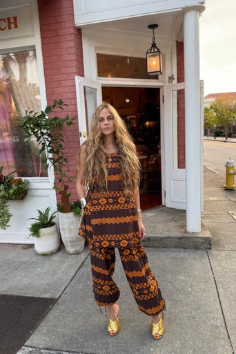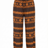 Fabric encased elastic at waist with functional self-fabric drawcord detail that is easily adjustable to be worn higher at true waist or lower depending on preference. Top edge has a self-turnback shirred ruffle finish that creates a sweet finishing touch. Slight drop crotch so there is flex fit ease built into the garment that supports free size fit. Straight leg that extends into tunnel detail at leg opening with encased self-drawcord that can be cinched at leg opening ankle area or can be just tied into cute bow at outer leg if wearer prefers!