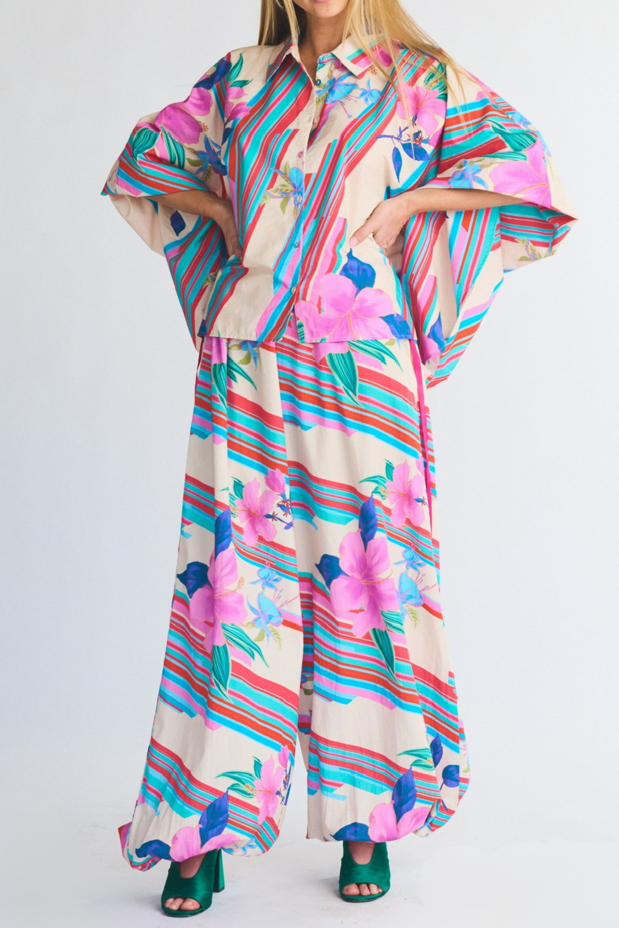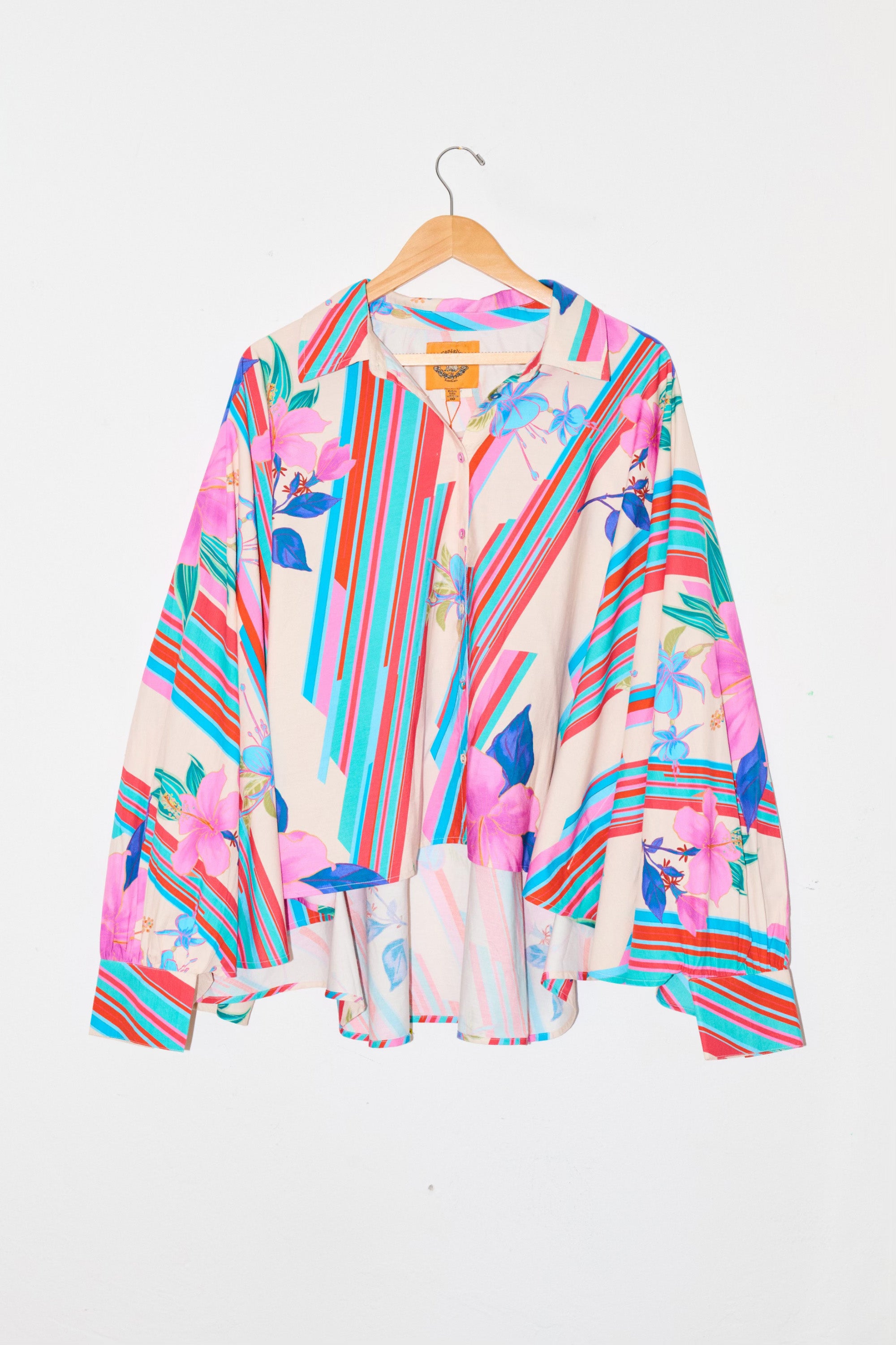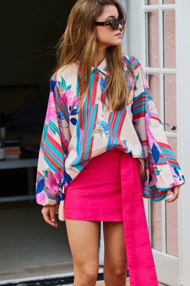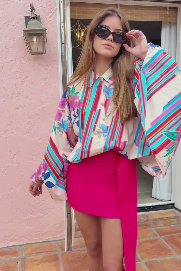 Is it a button down? Is it a tunic? Who cares? It’s fabulous! Modeled after our Classic Button Down and our Dolman Top, this new silhouette boasts functional self-wrapped button detail from the top collar throughout the body, allowing you to wear it closed as a traditional top or open as a layering item. A flowy bat-wing sleeve finishes in a structured buttoned cuff, while the billowy bodice provides the space and style for every body journey.