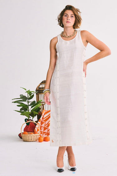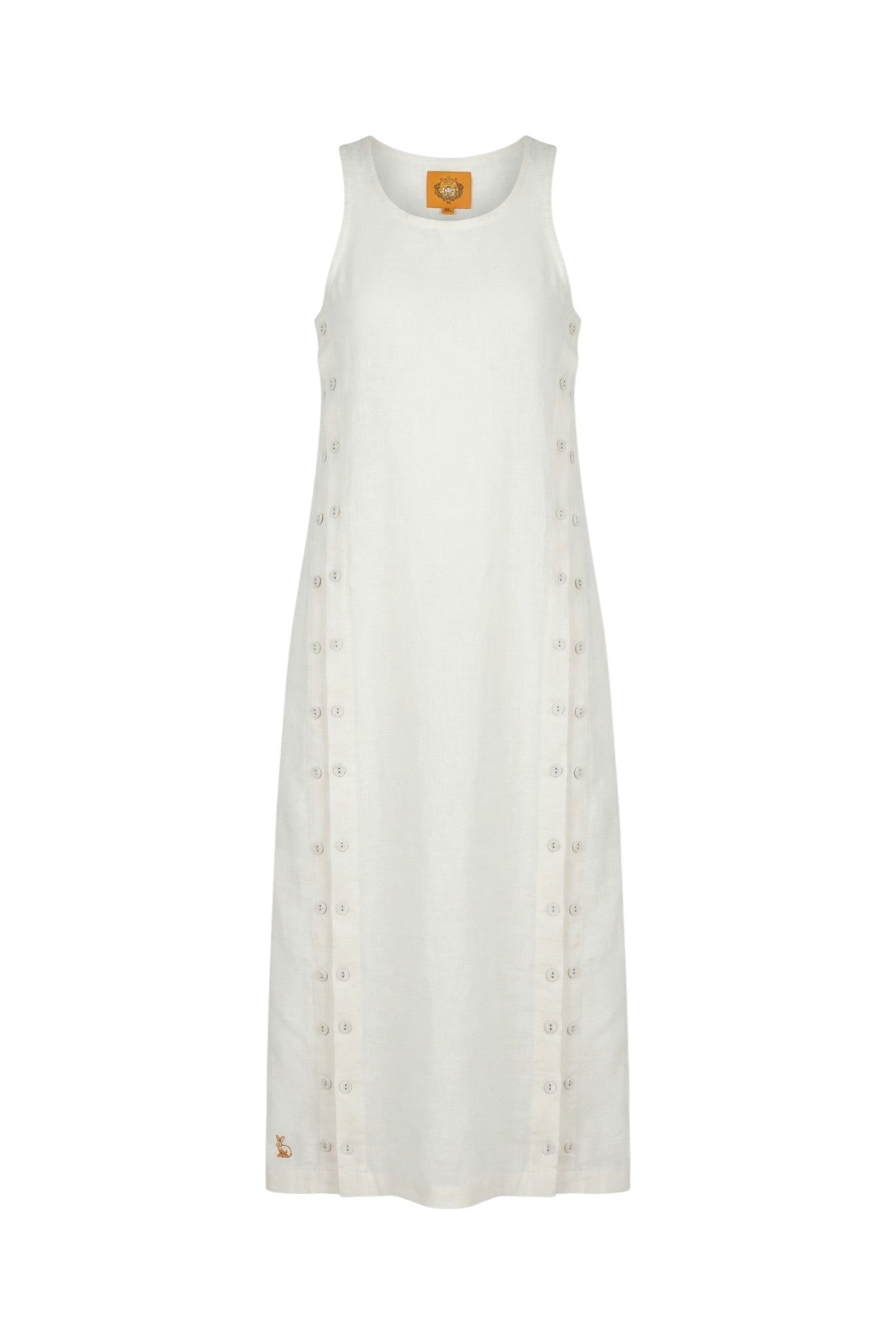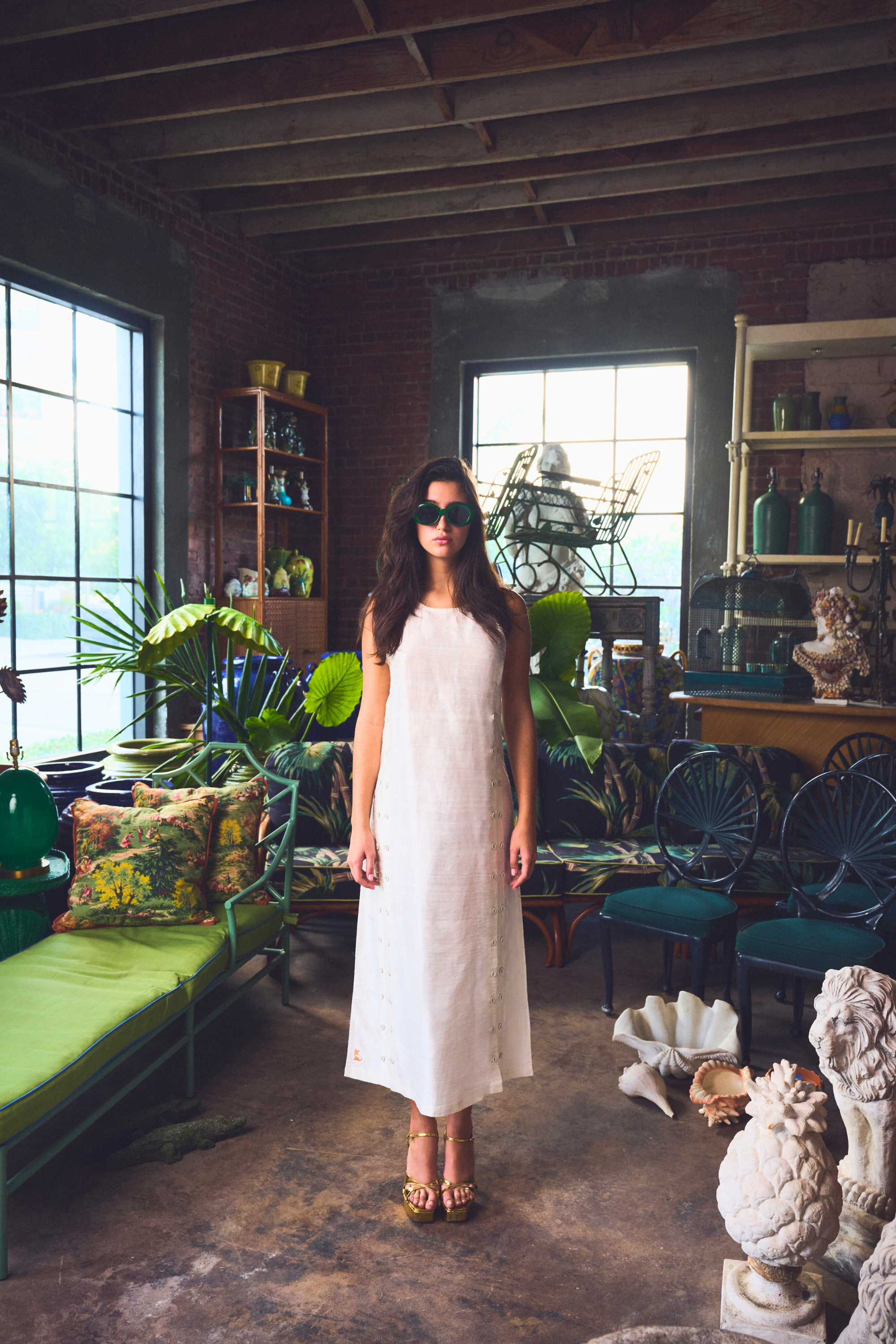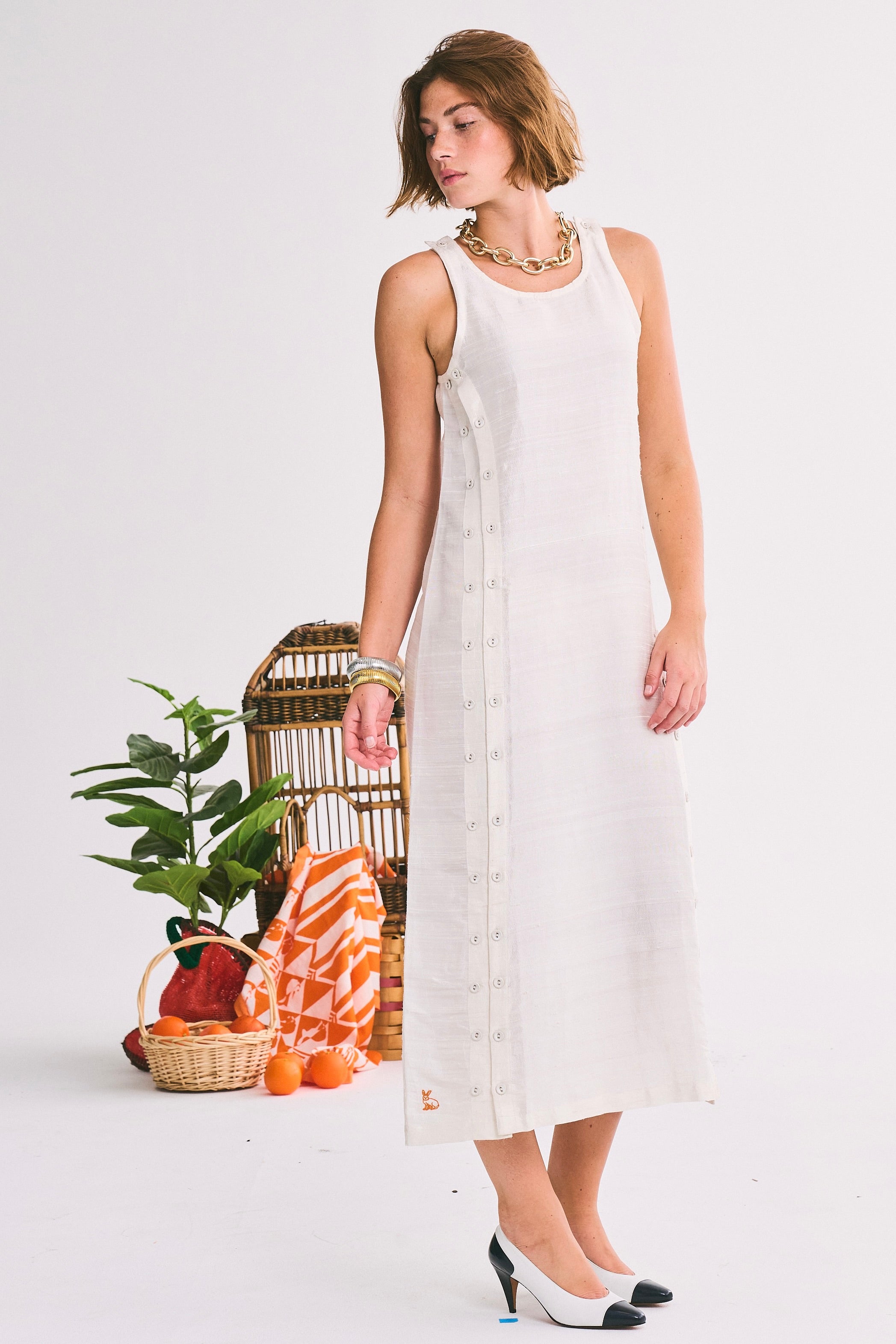 This new silhouette embodies everything we love about a classic shift and Free Size. Seven functional self covered buttons run along both sides of the dress, providing two different closures for our signature flex fit. Wear it as a dress or unbuttoned over vintage denim for a tunic style look. Two button closure at the shoulder so you can lower the neckline based on preference and fit attitude. This style is the epitome of ease, allowing the wearer to have a fitted shape but with functionality that creates a fit that shifts along with you.