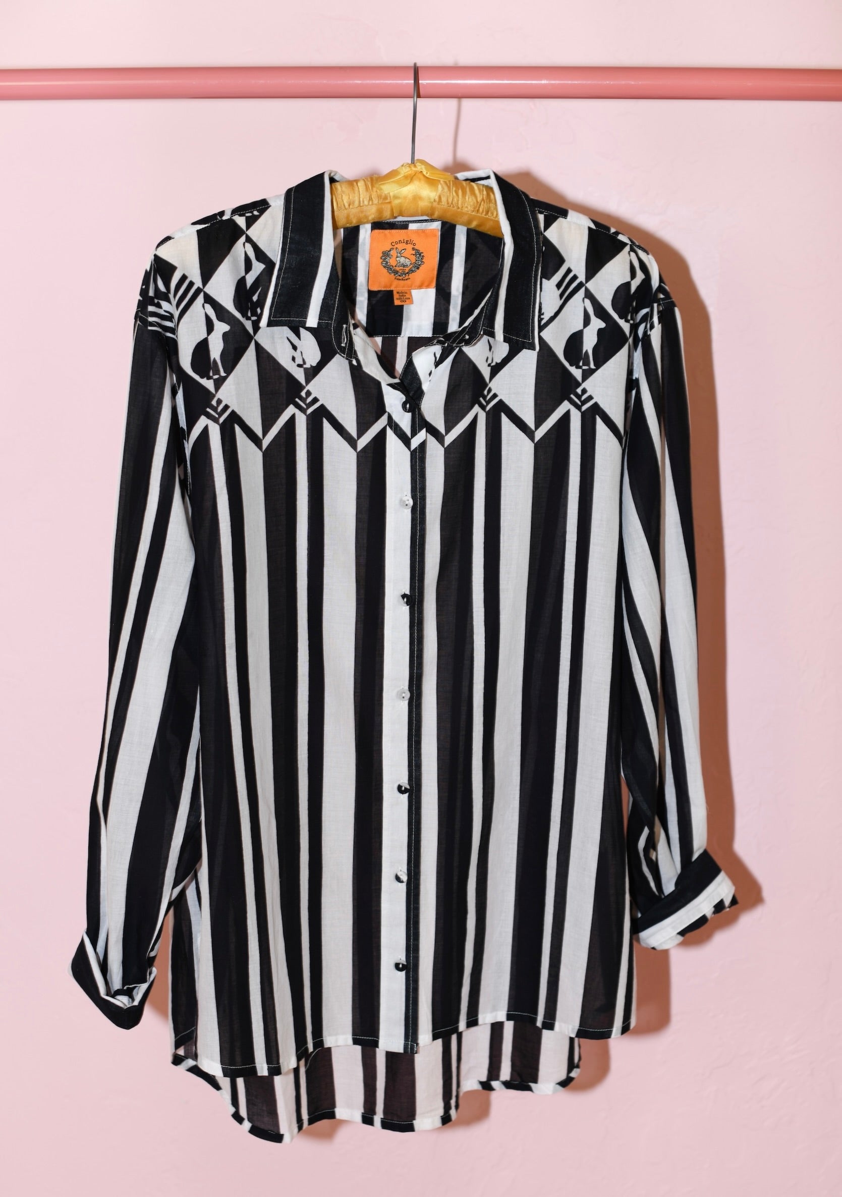 A longer fit at front and back body so it can be tucked in and worn with our signature Ruffle Power Pareo, but also supports a taller form. With functional center front placket and self-wrapped button detail that extends through the body, it can be worn closed as a traditional top or open as a layering item. Extra long sleeves with a tall cuff can be worn down based on your arms length, or folded back and cuffed up for a more petite length arm, or a casual feel.