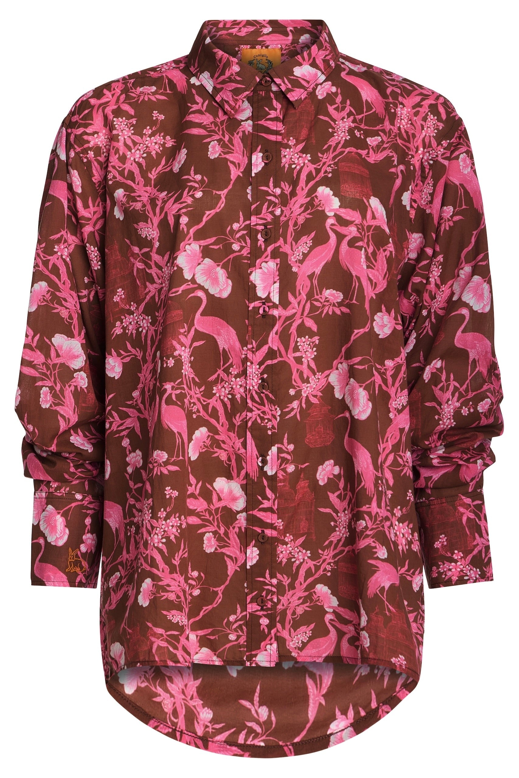 A longer fit at front and back body so it can be tucked in and worn with our signature Ruffle Power Pareo, but also supports a taller form. With functional center front placket and self-wrapped button detail that extends through the body, it can be worn closed as a traditional top or open as a layering item. Extra long sleeves with a tall cuff can be worn down based on your arms length, or folded back and cuffed up for a more petite length arm, or a casual feel.