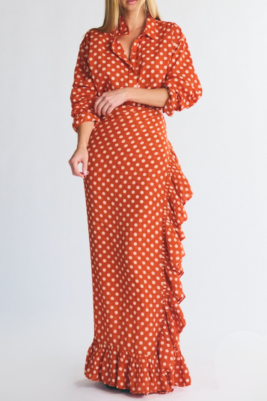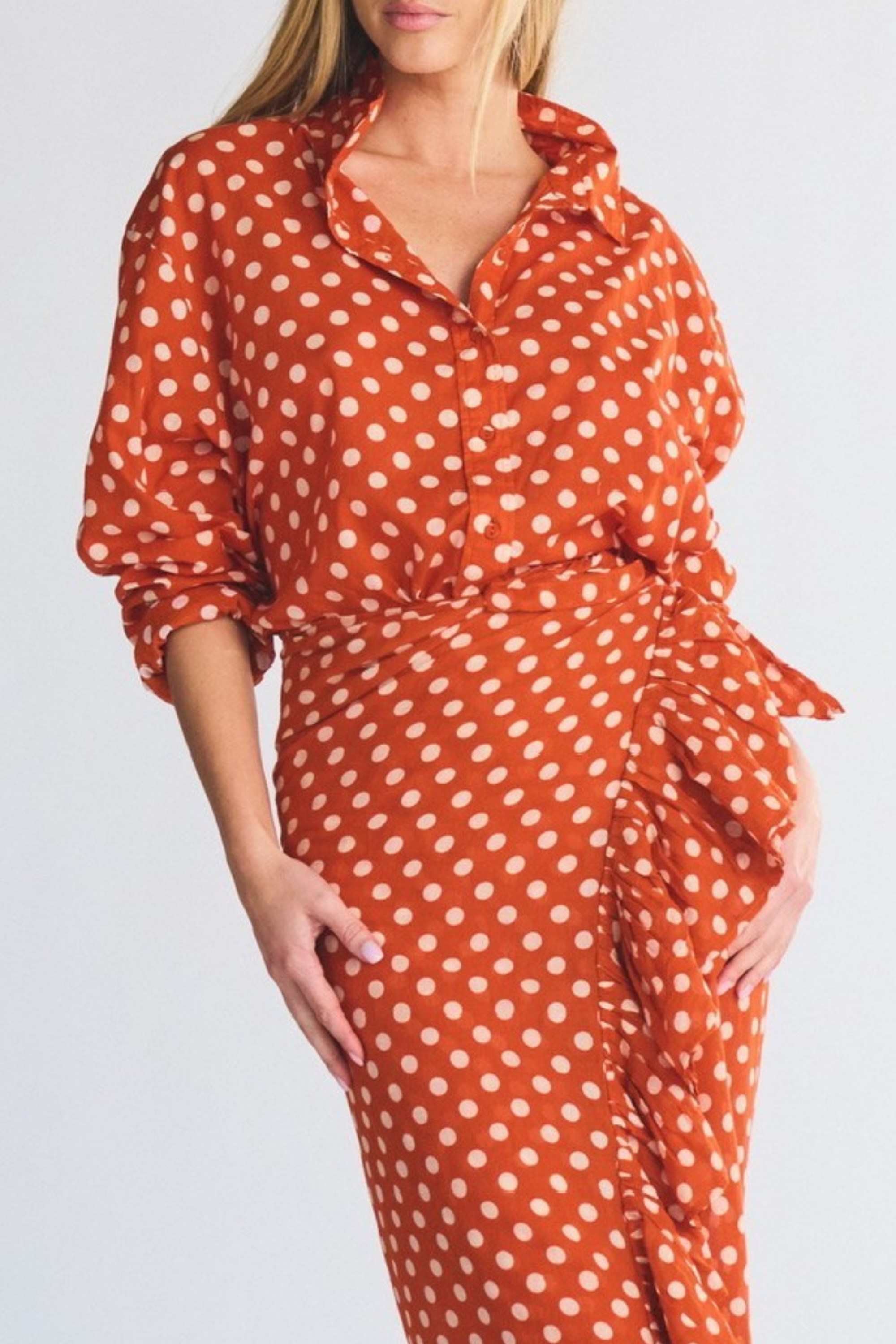 A longer fit at front and back body so it can be tucked in and worn with our signature Ruffle Power Pareo, but also supports a taller form. With functional center front placket and self-wrapped button detail that extends through the body, it can be worn closed as a traditional top or open as a layering item. Extra long sleeves with a tall cuff can be worn down based on your arms length, or folded back and cuffed up for a more petite length arm, or a casual feel.