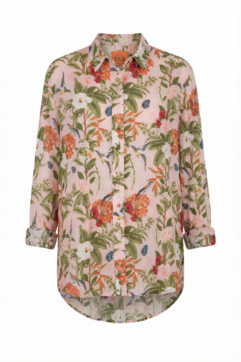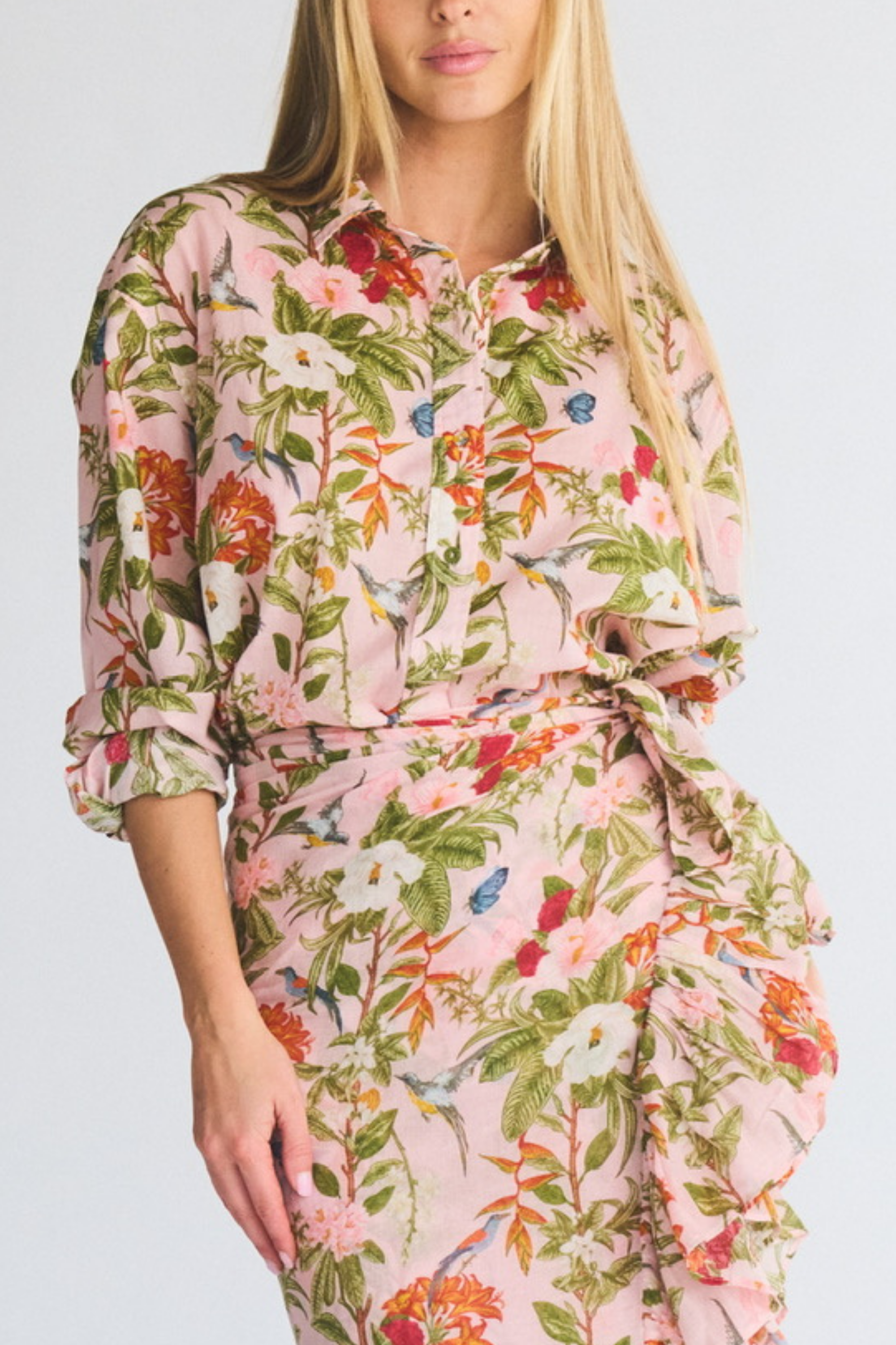 A longer fit at front and back body so it can be tucked in and worn with our signature Ruffle Power Pareo, but also supports a taller form. With functional center front placket and self-wrapped button detail that extends through the body, it can be worn closed as a traditional top or open as a layering item. Extra long sleeves with a tall cuff can be worn down based on your arms length, or folded back and cuffed up for a more petite length arm, or a casual feel.