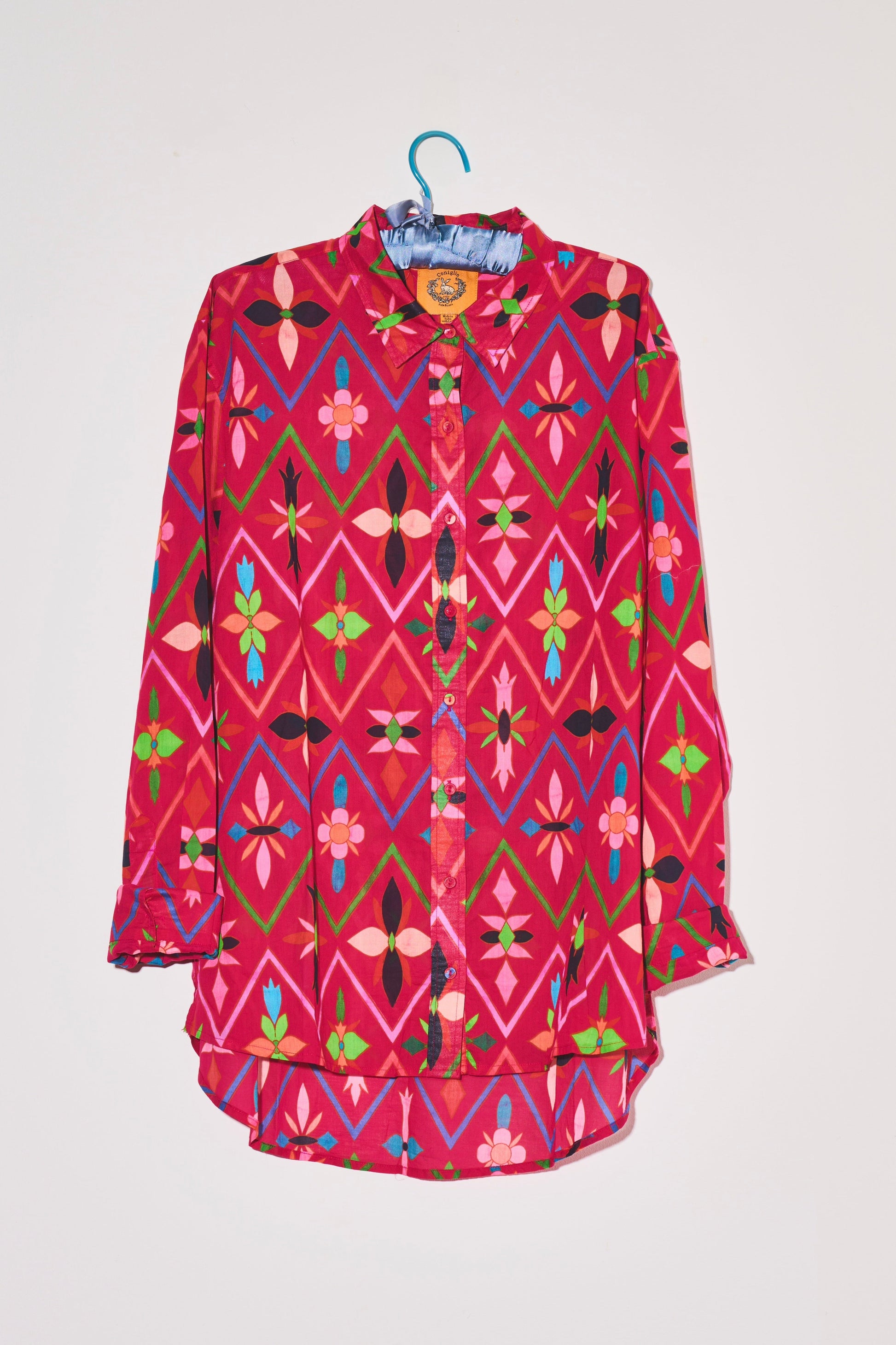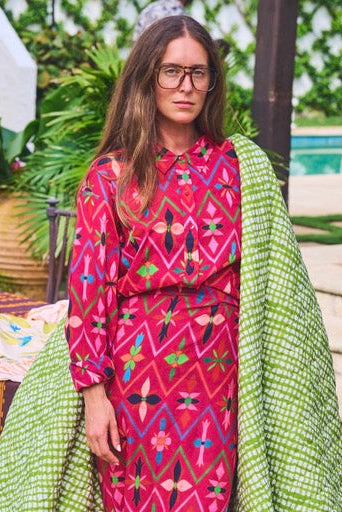 A longer fit at front and back body so it can be tucked in and worn with our signature Ruffle Power Pareo, but also supports a taller form. With functional center front placket and self-wrapped button detail that extends through the body, it can be worn closed as a traditional top or open as a layering item. Extra long sleeves with a tall cuff can be worn down based on your arms length, or folded back and cuffed up for a more petite length arm, or a casual feel.