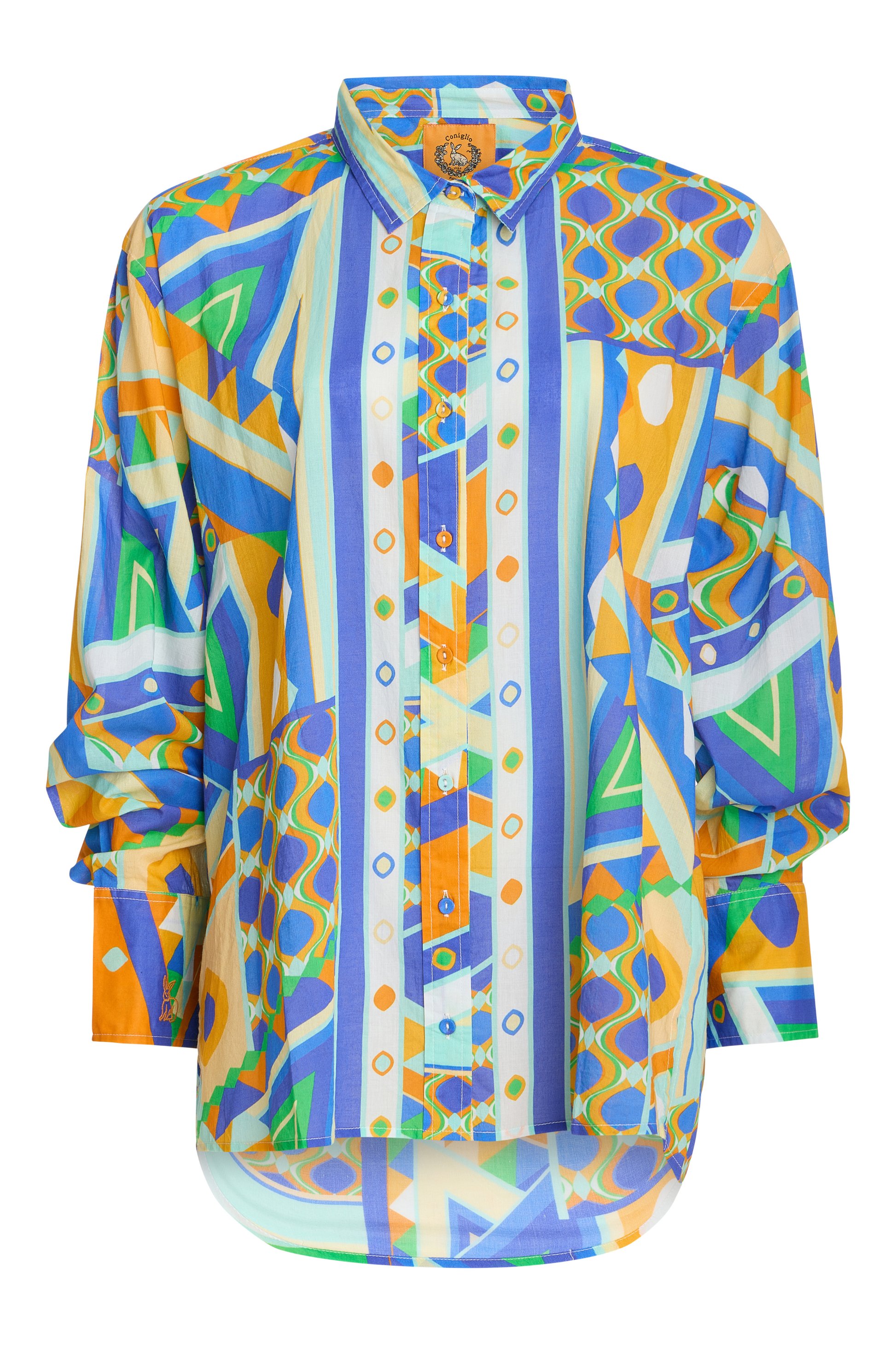 A longer fit at front and back body so it can be tucked in and worn with our signature Ruffle Power Pareo, but also supports a taller form. With functional center front placket and self-wrapped button detail that extends through the body, it can be worn closed as a traditional top or open as a layering item. Extra long sleeves with a tall cuff can be worn down based on your arms length, or folded back and cuffed up for a more petite length arm, or a casual feel.