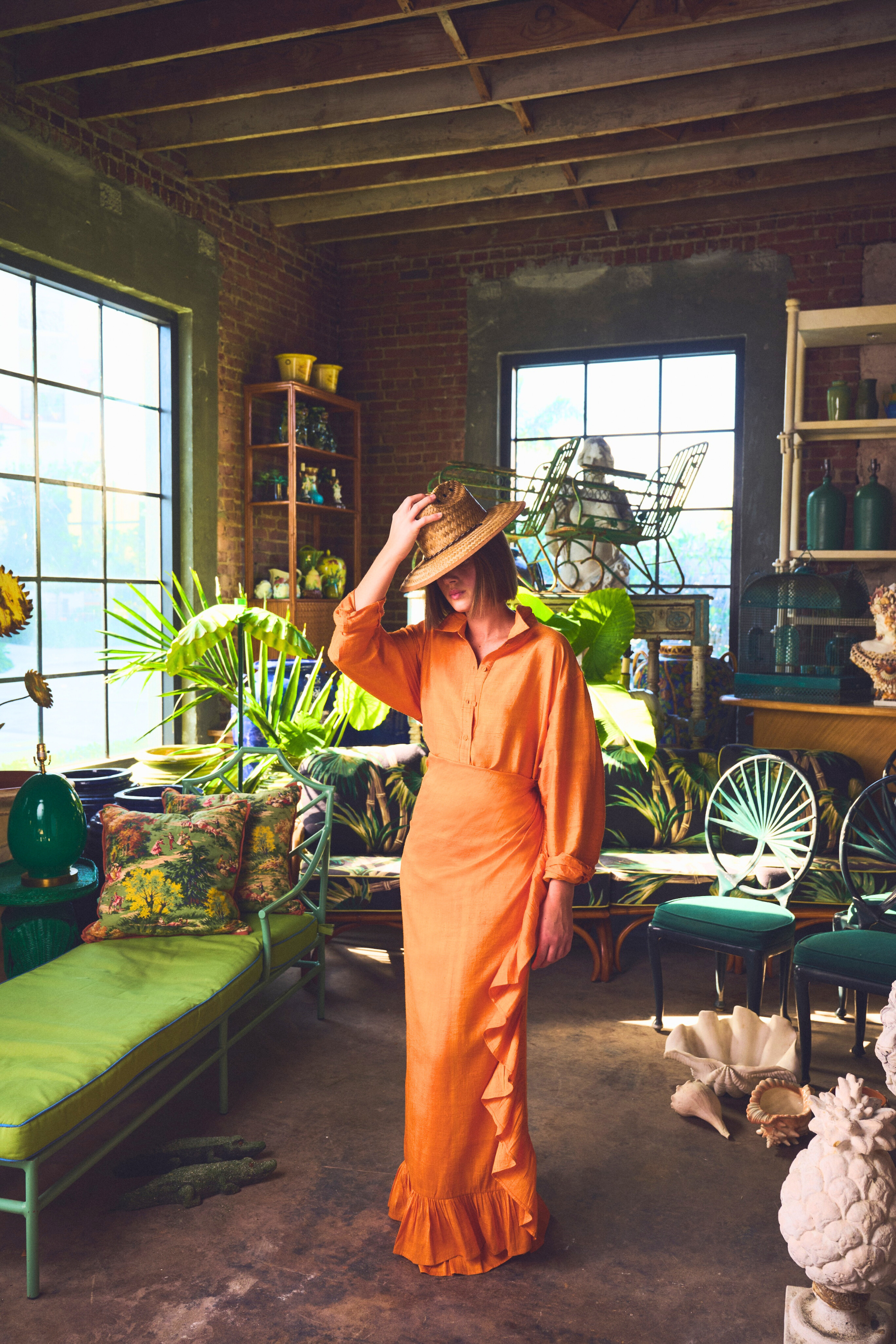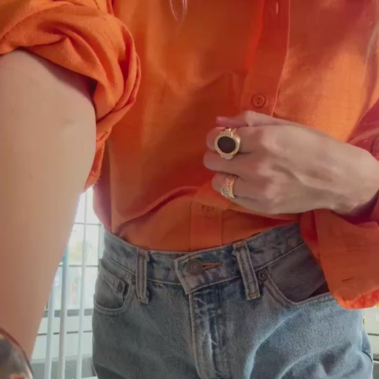 A longer fit at front and back body so it can be tucked in and worn with our signature Ruffle Power Pareo, but also supports a taller form. With functional center front placket and self-wrapped button detail that extends through the body, it can be worn closed as a traditional top or open as a layering item. Extra long sleeves with a tall cuff can be worn down based on your arms length, or folded back and cuffed up for a more petite length arm, or a casual feel.