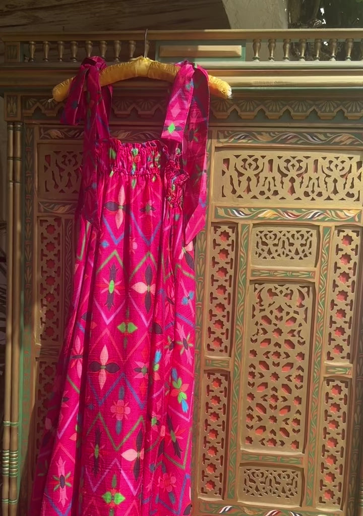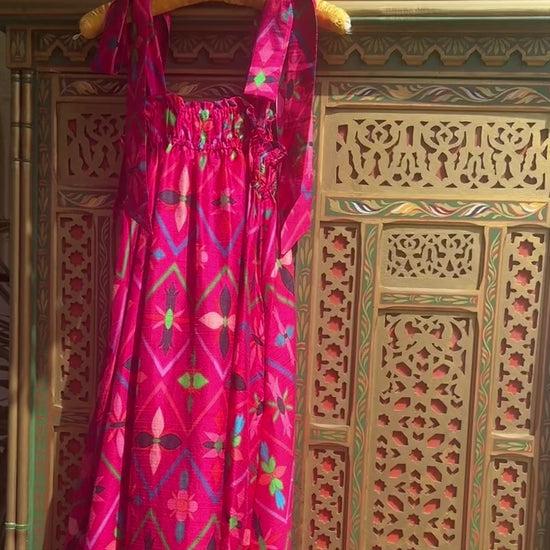 A smocked top with functional elastic tunnels extends into a flowing skirt that you’ll want to live in this summer. Simple and fuss free, just an easy style that offers elevated elegance in our signature silk dupioni fabric. Self-ties at the shoulder can be tucked in if you want to wear as a strapless dress!