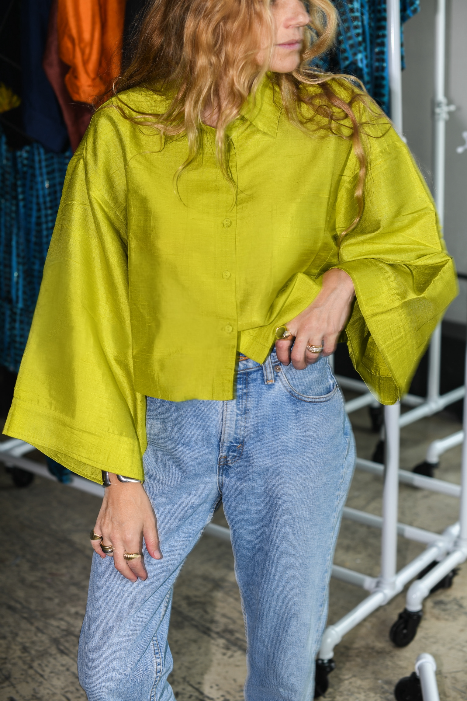 A classic play on a button down but with all the extra construction bells and whistles that make her pretty much the best! Boxy and voluminous, she fits a range of body types but still gives you an ultra-sexy modern look with the crop length. Adorable breast pocket and back yoke with deep full pleat are just some of the beautiful design details. The sleeve opening cuff is also fully functional with self fabric wrapped buttons that you can use as needed! Deep hem finishes at the sweep and sleeve opening that can be released to add length if needed.