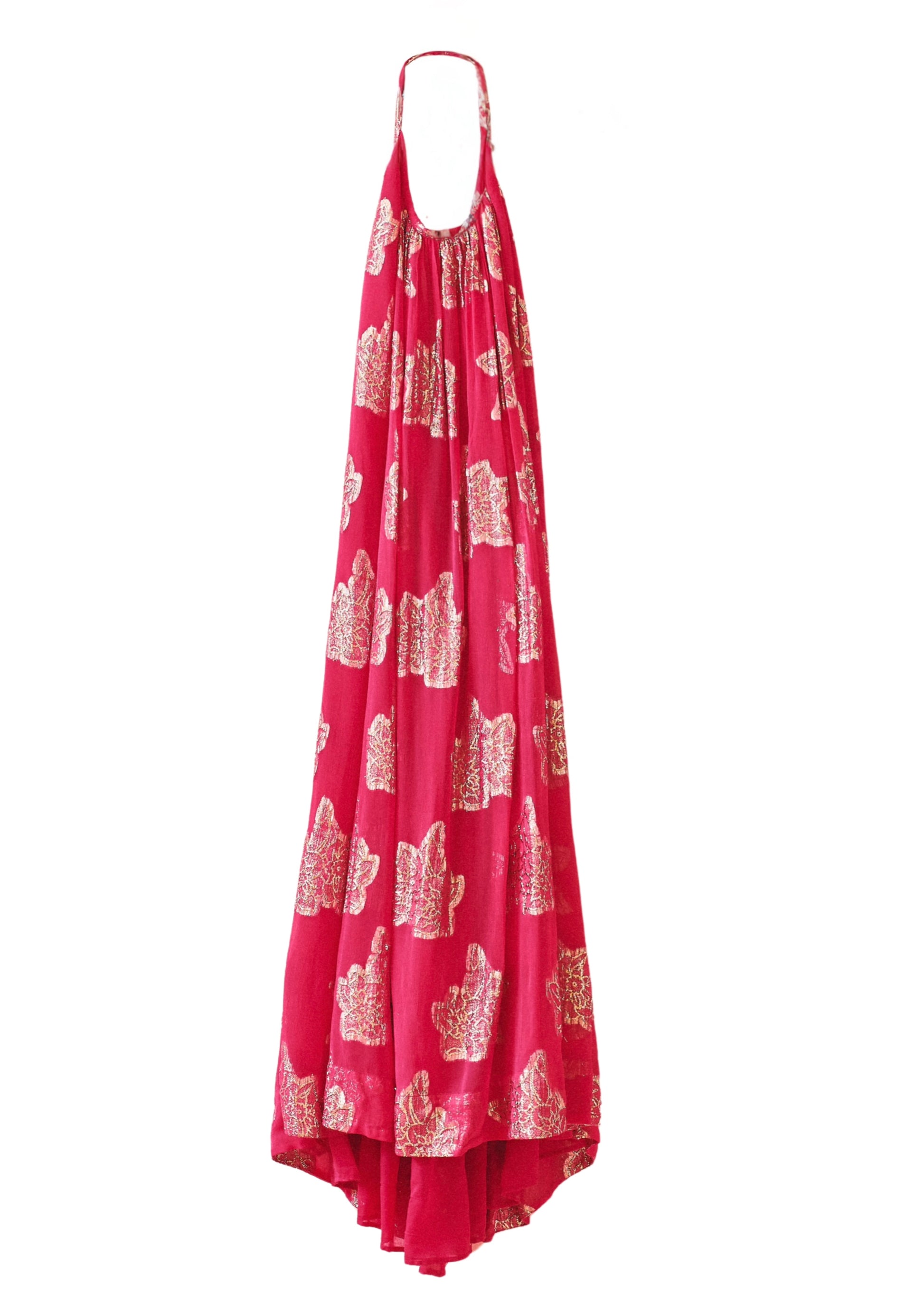 Flex fit halter dress that can be tied at the back neck or at the shoulder positions based on wearers preference. High low shape giving it that extra edge of glamour! Slight shirring at front neck edge provides a beautiful and elegant look which extends into the body of the garment and sweep for a voluminous and dramatic finish. Deep hem that can be released to add length if needed. Side seam pockets adds a detail and element of total ease and girl on the go energy. Low back neck when worn as a halter with a narrow elastic detail that creates a cinch so fits around body snugly but with extended comfort. Fully lined.