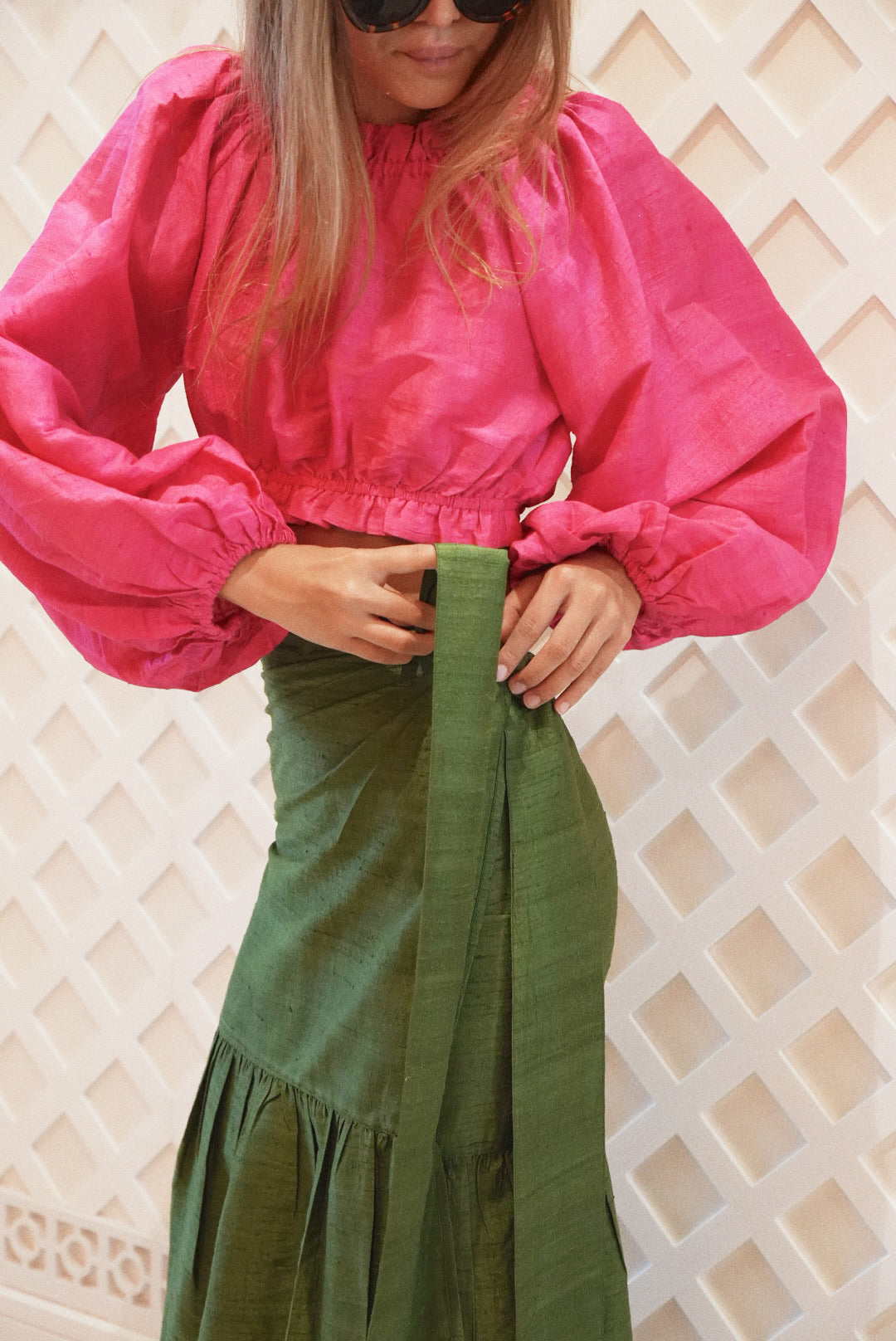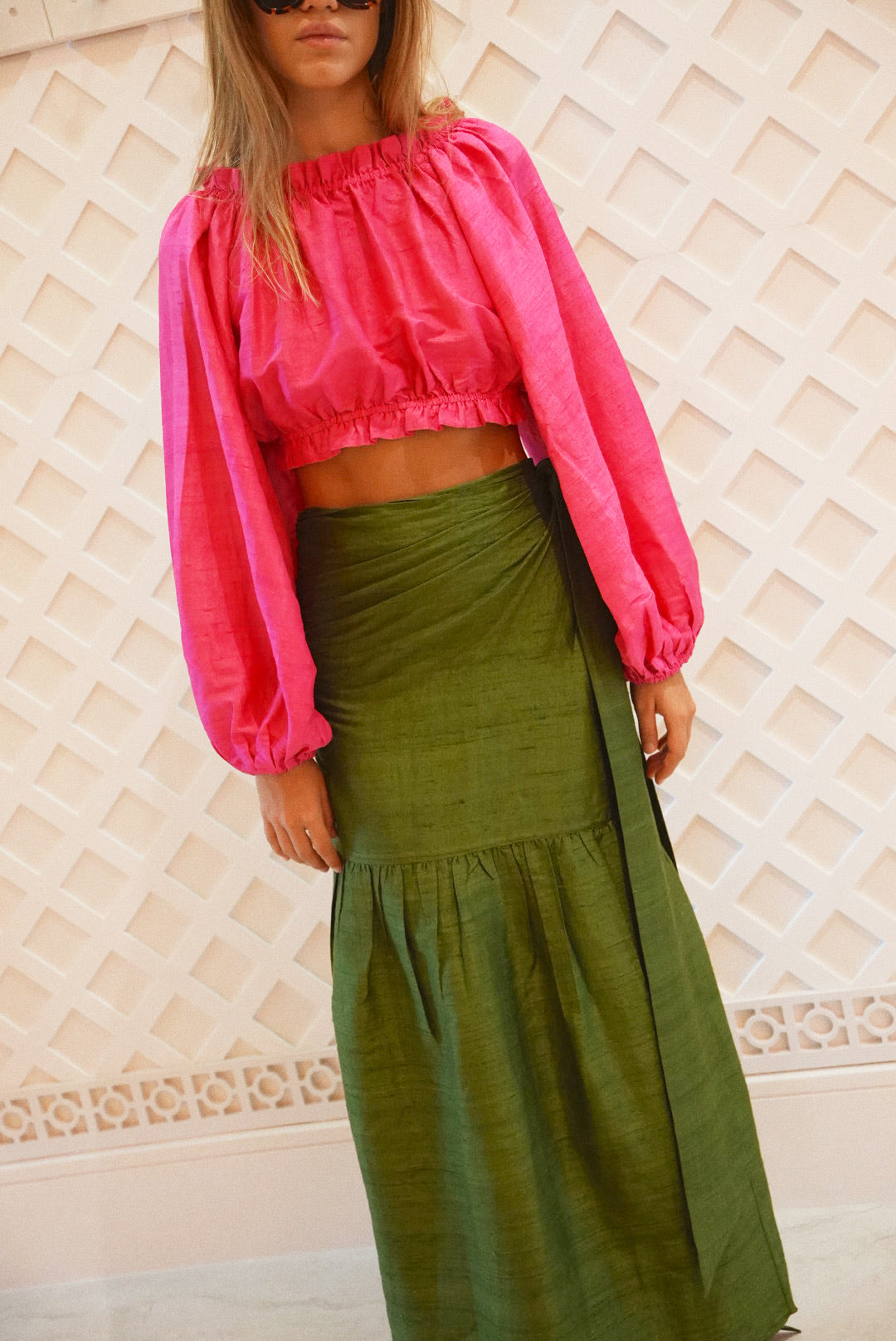 Think ruffle power pareo meets wrap around skirt in the BEST possible way. The shirring from mid-leg to the ankle provides a feminine touch, while the structured wrap at the waist creates a polished look. Pair it with a matching top in silk dupioni for the perfect party style or a cotton Baby Tee for a dressed down and chill vibe. No matter how you wear it, this skirt will be your new favorite piece!
