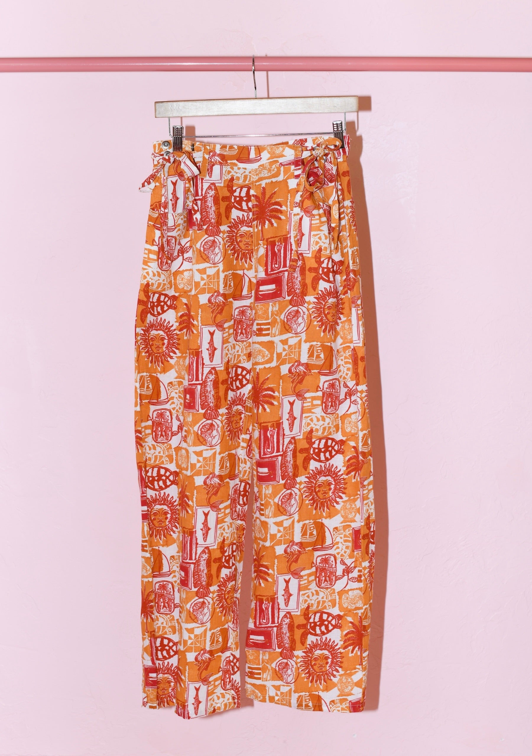 Designed to be flex fit this pant is adorned at the waist band with two sets of snaps on either side of the body. It can be snapped to a S/L fit based on preference and has two ties that create adorable finished bows after snapping! They are based on a tear away pant from the 70s and will be a forever staple! The waist extends to 38” inches when unsnapped and is a forever easy pull on style.