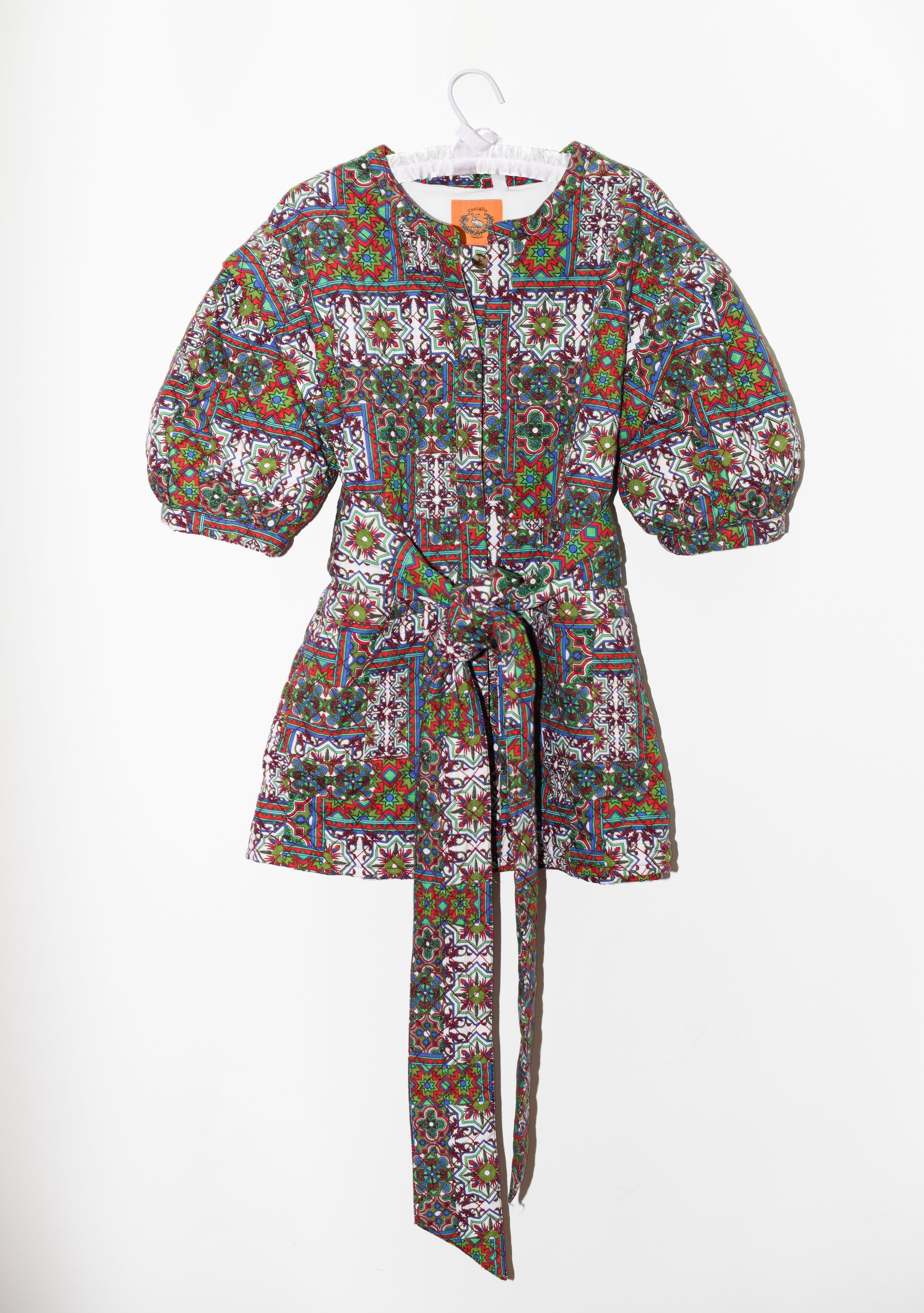 Think Ren Faire gone wild! The pleated shoulder detail extends into a puff sleeve for the perfect masculine and feminine mix. Novelty center front buttons and self loops keep this piece wearable as a dress or jacket, while the deep front patch pockets provide a functional design element. Wear it loose or cinched with the matching wide self tie belt—she’s perfect in every way!
