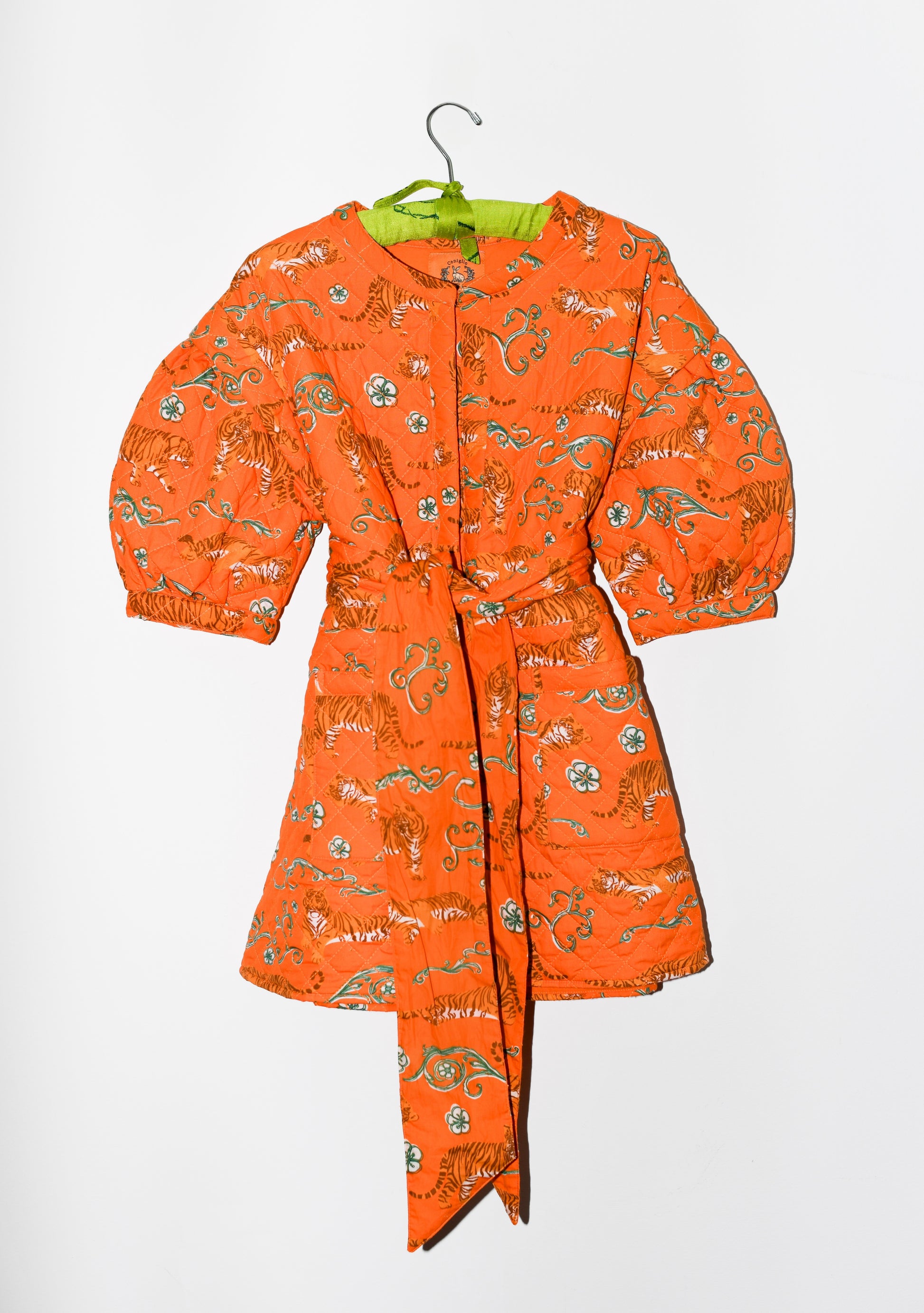 Think Ren Faire gone wild! The pleated shoulder detail extends into a puff sleeve for the perfect masculine and feminine mix. Novelty center front buttons and self loops keep this piece wearable as a dress or jacket, while the deep front patch pockets provide a functional design element. Wear it loose or cinched with the matching wide self tie belt—she’s perfect in every way!