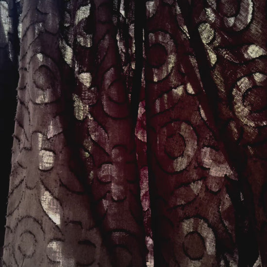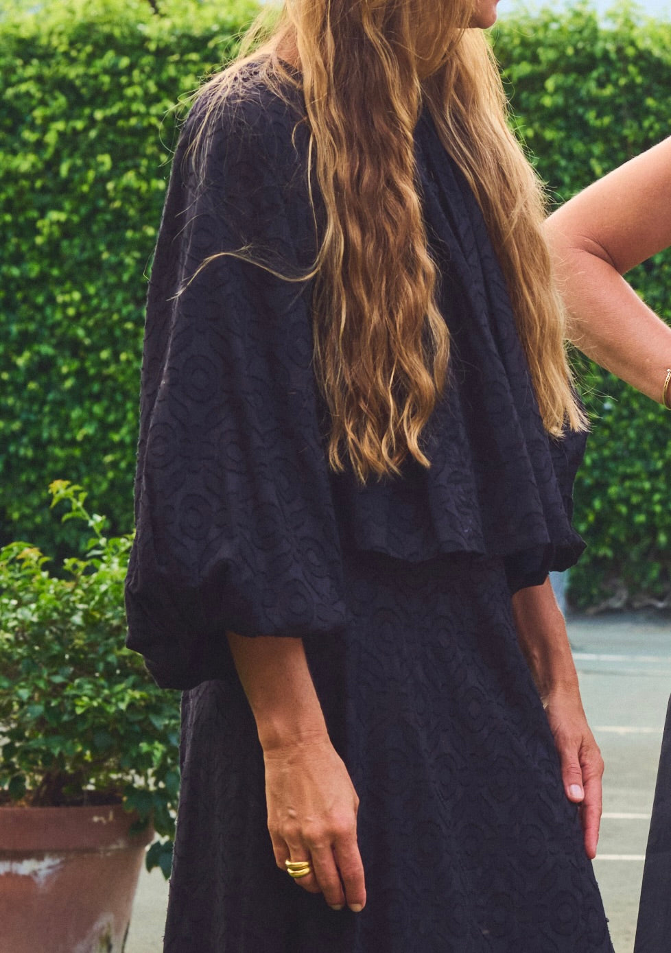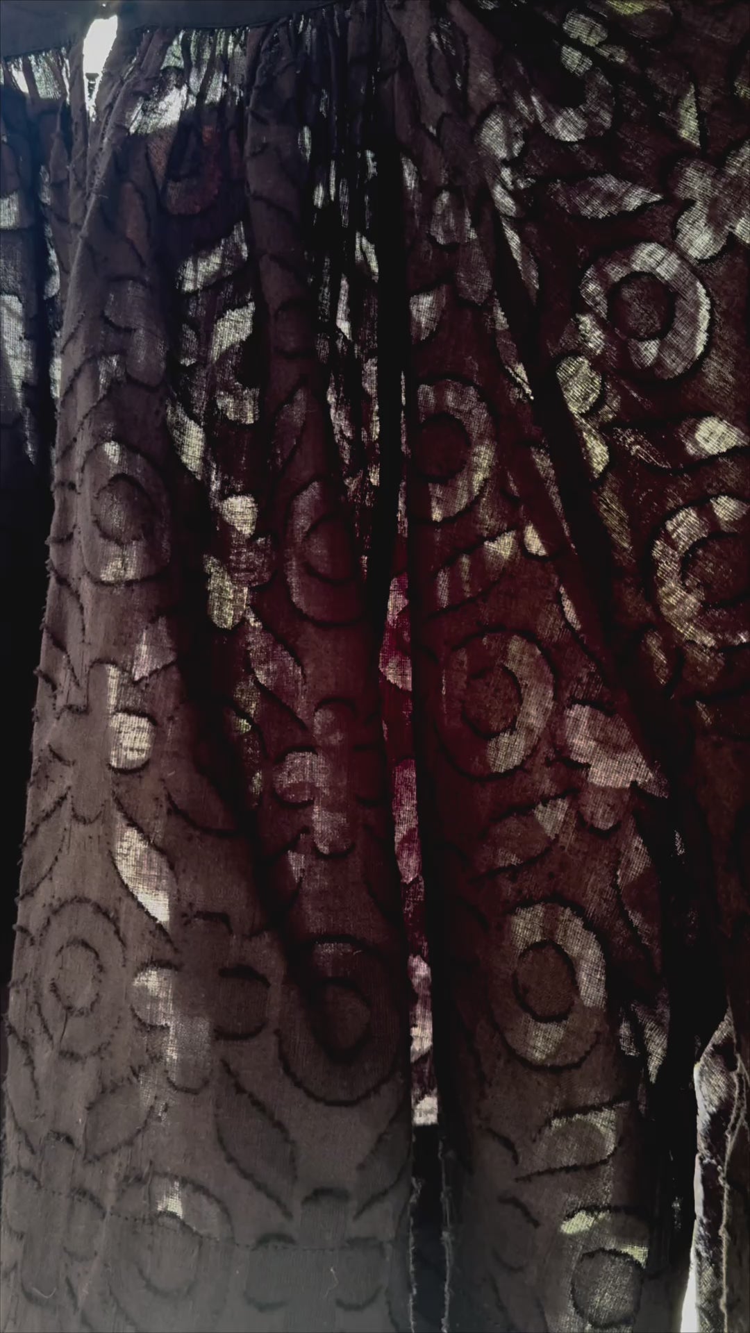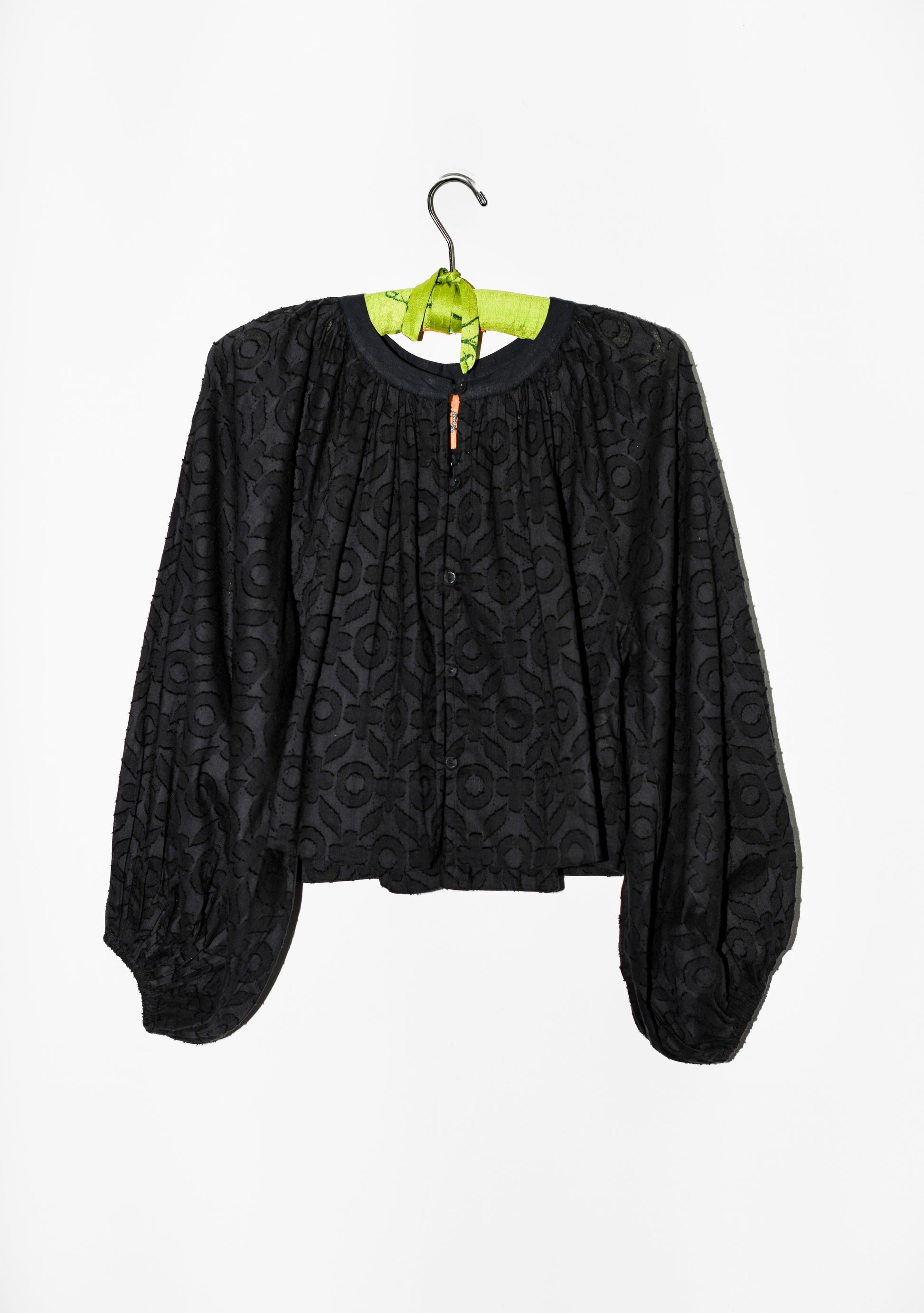 Beautiful, exaggerated shirring along the neck extends into the sweep resulting in a voluminous shape that is truly the perfect flex fit style. The center yoke of self-covered button and loops from neck to hem provide a feminine touch, while also allowing the piece to be worn open as a jacket. An elasticated sleeve offers plenty of room for ease and comfort depending on your forearm measurement.