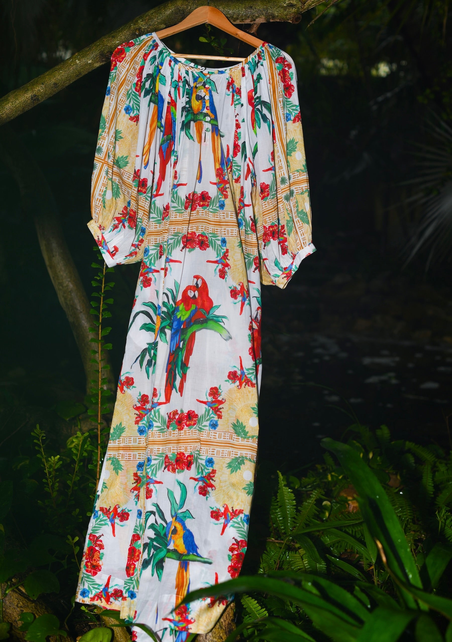 Beautiful, exaggerated shirring along neck extends into the sweep resulting in a voluminous shape that is truly the perfect flex fit style. Half placket detail at center front with delicate self-binding finish and self-covered button and loops that give it that feminine look. Sleeve opening has a self-covered button and loop but has plenty of room at the opening for ease and comfort depending on your forearm measurement. Deep hem that can be released to add length if needed.