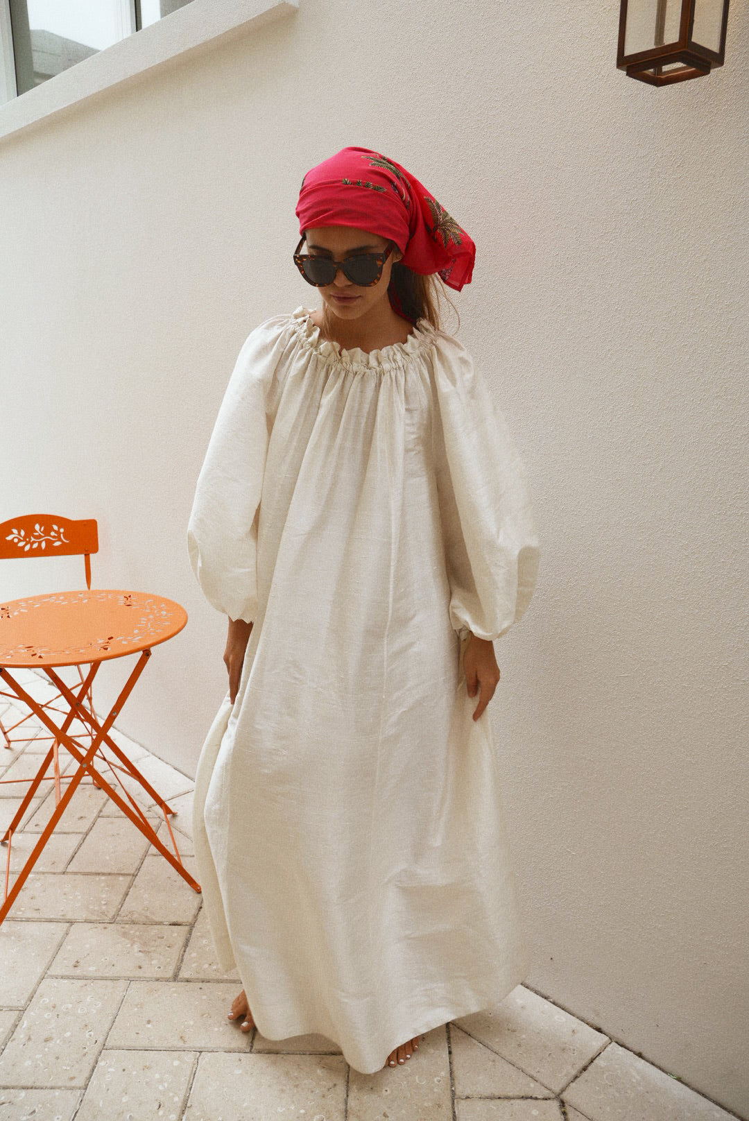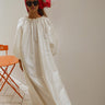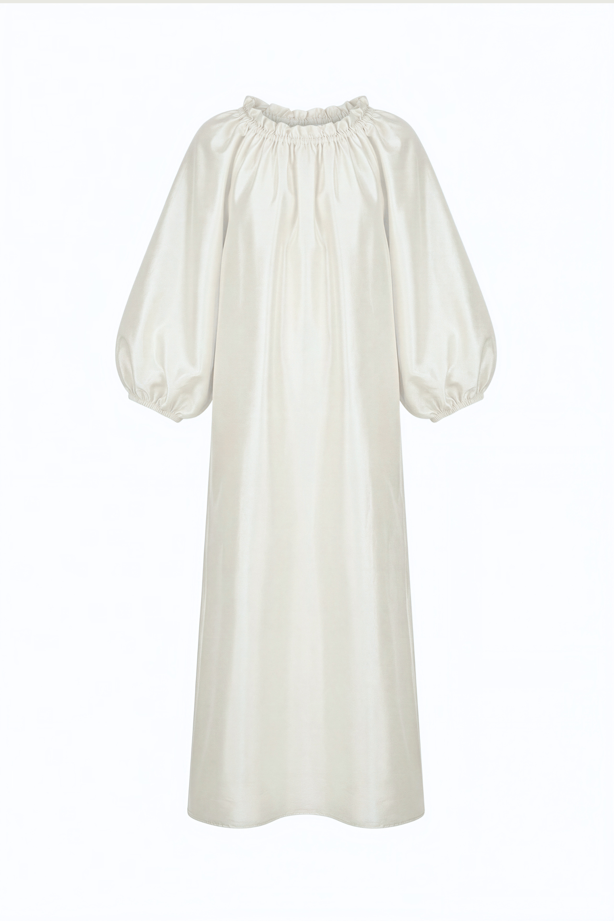 A new silhouette that is relaxed and effortless. Self encased elasticated detail with ruffle neckline, can be worn as a scoop neck or off the shoulder and extends into a full skirt to fit 0-16. The voluminous sleeve with an elastic sleeve opening closure offers extra drama to an already show-stopping piece. Side seam pocket details and deep hem finish.
