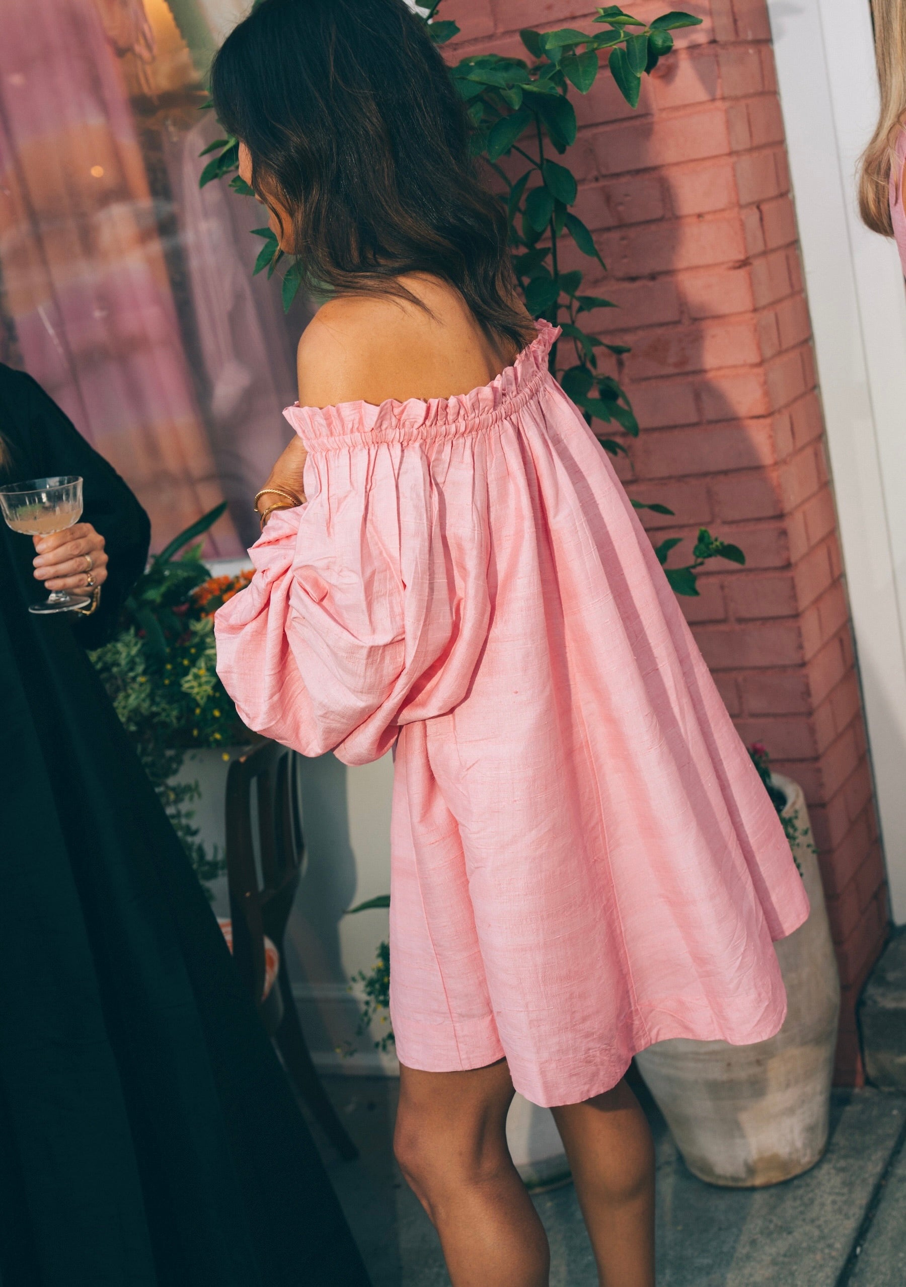 A new silhouette that is relaxed and effortless. Self encased elasticated detail with ruffle neckline, this dress is meant to be worn off the shoulder for a va-va-voom look! The voluminous sleeve with an elastic sleeve opening closure offers extra drama to an already show-stopping piece. Side seam pocket details and deep hem finish.